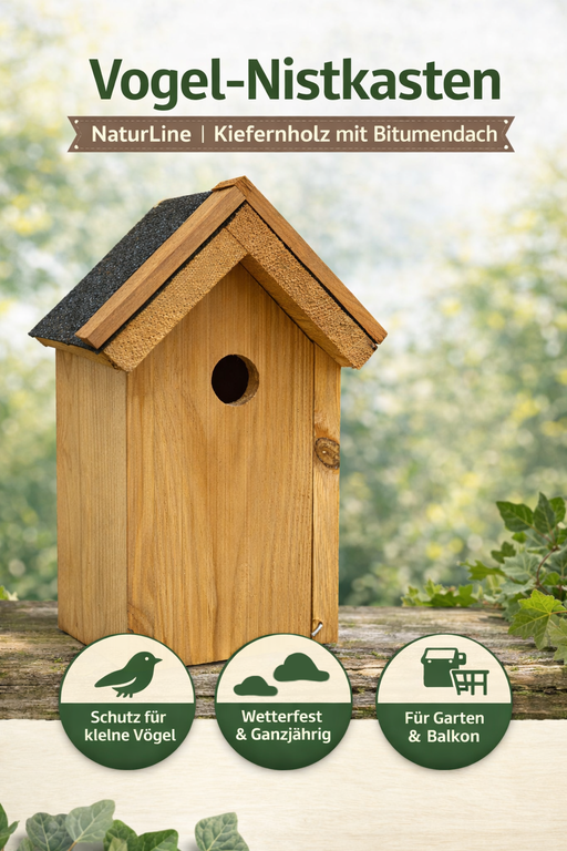 Vogel-Nistkasten „NaturLine“ – Kiefernholz mit Bitumendach Sicherer Schutz für kleine VögelSchützt zuverlässig vor Nesträubern sowie vor Wind, R...